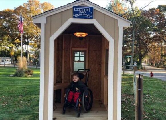 Ryder, de 5 anos, sempre esperava o ônibus da escola em uma parada sem cobertura e estrutura. Para melhorar um pouco a situação, a família do menino colocou um guarda-sol, mas não impedia que o garoto se molhasse em dias mais chuvosos.