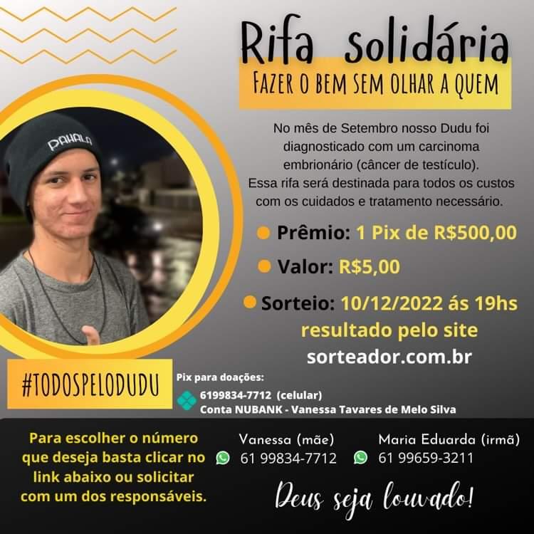 A mãe do jovem Carlos Eduardo ( o Dudu), de 17 anos de idade, está fazendo uma Rifa online e solidária para ajudar a custear o tratamento e os cuidados necessários para o filho que foi diagnosticado com carcinoma embrionário (câncer de testículo).