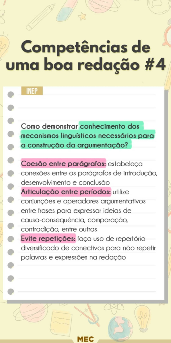 “Vocês pediram spoiler sobre a redação do Enem. Spoiler, eu não posso dar, mas segue uma dicazinha para vocês”, disse o MEC na postagem, que contem passos de como escrever uma boa redação, destacando a competência 4 do manual de correção da redação do Enem