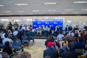 O Governo do Distrito Federal (GDF) assinou, nesta terça-feira (6), o decreto de regulamentação da Lei Complementar n° 986/2021, que trata sobre a Regularização Fundiária Urbana (Reurb). Ao lado do governador Ibaneis Rocha e demais autoridades, o vice-governador Paco Britto participou da cerimônia, no Salão Branco do Palácio do Buriti, onde comunidades beneficiadas seguravam faixas de agradecimento ao governo. Devido à pandemia de covid-19, foi feita a distribuição de insumos aos presentes, como unidades de álcool gel e máscaras, pelo Comitê Todos Contra a Covid, coordenado pelo Paco Britto.