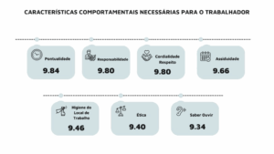 Segundo os lojistas entrevistados, o comportamento proativo é o principal pré-requisito para seleção, citado por 27,2%. Em seguida, aparecem local de moradia (14,2%), flexibilidade de horário (13,9%) e disponibilidade em tempo integral (12%). Além disso, pontualidade, responsabilidade, respeito e assiduidade são posturas fundamentais para a permanência no trabalho.