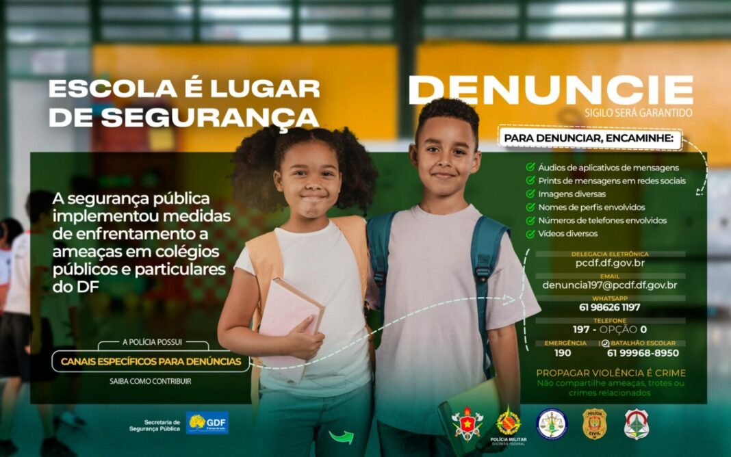 A população pode contactar a Secretaria de Segurança Pública (SSP) para o relato de ameaças e casos de apologia à violência nas escolas por meio dos telefones 190 (emergência) e 197, Opção 0; dos números de WhatsApp (61) 98626-1197 e (61) 99968-8950 (Batalhão Escolar); e de forma digital pelo site da Delegacia Eletrônica ou pelo e-mail denuncia197@pcdf.df.gov.br.