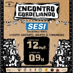 Acontece na próxima quarta-feira (12), no SESI – Taguatinga Norte, o Encontro Cordeliando. O evento é parte integrante do Projeto Cordeliando Pela Literatura de Cordel, que durante os meses de setembro e outubro passaram em 9 (nove) escolas da Regional Taguatinga que compreende as cidades de Vicente Pires, Arniqueiras e Águas Claras.