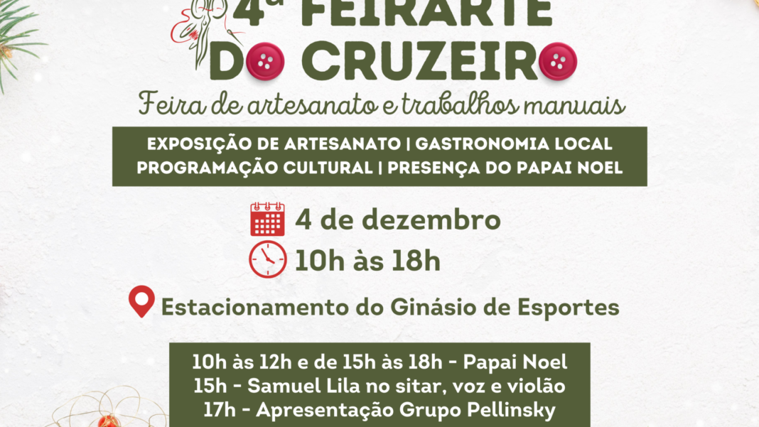 No próximo sábado (4), a Administração Regional do Cruzeiro promoverá a 4ª Feirarte, edição de Natal. O evento será realizado das 10h às 18h, no estacionamento do Ginásio de Esportes da cidade.