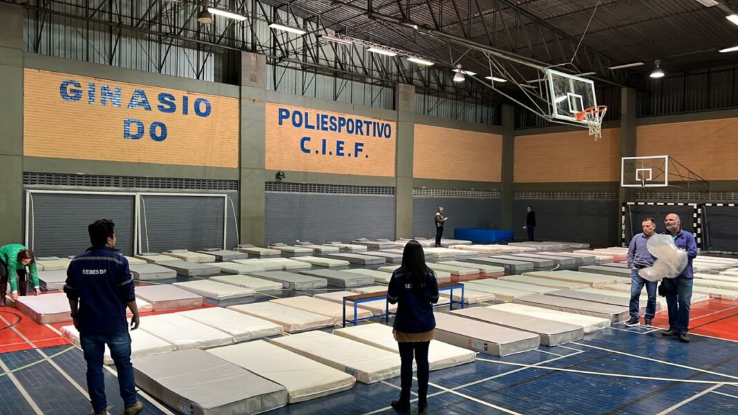 O pernoite provisório para população em situação de rua foi aberto na noite dessa quinta-feira (19), no Ginásio Poliesportivo do Centro de Interescolar de Esporte (CIEF), na Quadra 907/8 Sul. Esse foi o primeiro abrigo instalado emergencialmente pelo Governo do Distrito Federal (GDF) para acolher pessoas durante a frente fria que se instalou na cidade. A unidade funciona das 20h às 8h.