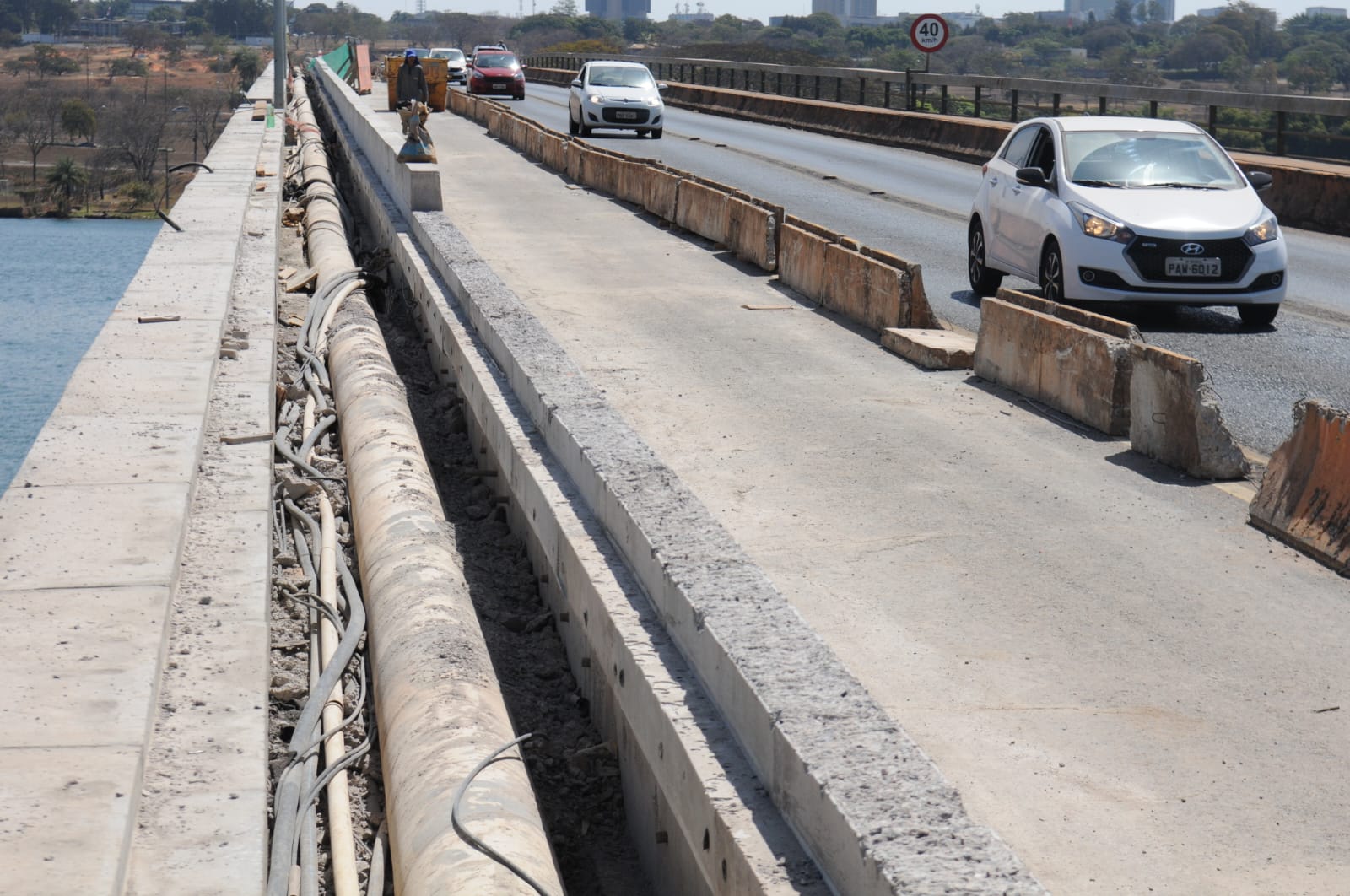 Estão sendo contruídas barreiras laterais New Jersey – feitas de concreto e usadas como proteção para pedestres – e adequação do nível da superfície superior, de modo a permitir que os motoristas que passam pelo local possam ter a vista do Lago Paranoá enquanto trafegam.