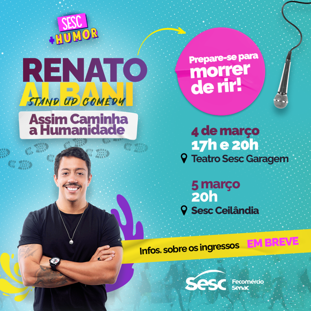 Nos dias 4 e 5 de março, acontecerá o Sesc + Humor com apresentações de stand up do artista e comediante Renato Albani. O show “Assim caminha a humanidade” ocorrerá em sessões no Teatro Sesc Garagem (clique aqui e garanta seu ingresso) e na unidade de Ceilândia (clique aqui e garanta seu ingresso), confira programação abaixo. O acesso será gratuito mediante retirada de ingressos pelo Sympla (www.sympla.com.br) ou nas bilheterias dos teatros do Sesc-DF, a partir das 12h, nos dias dos espetáculos.