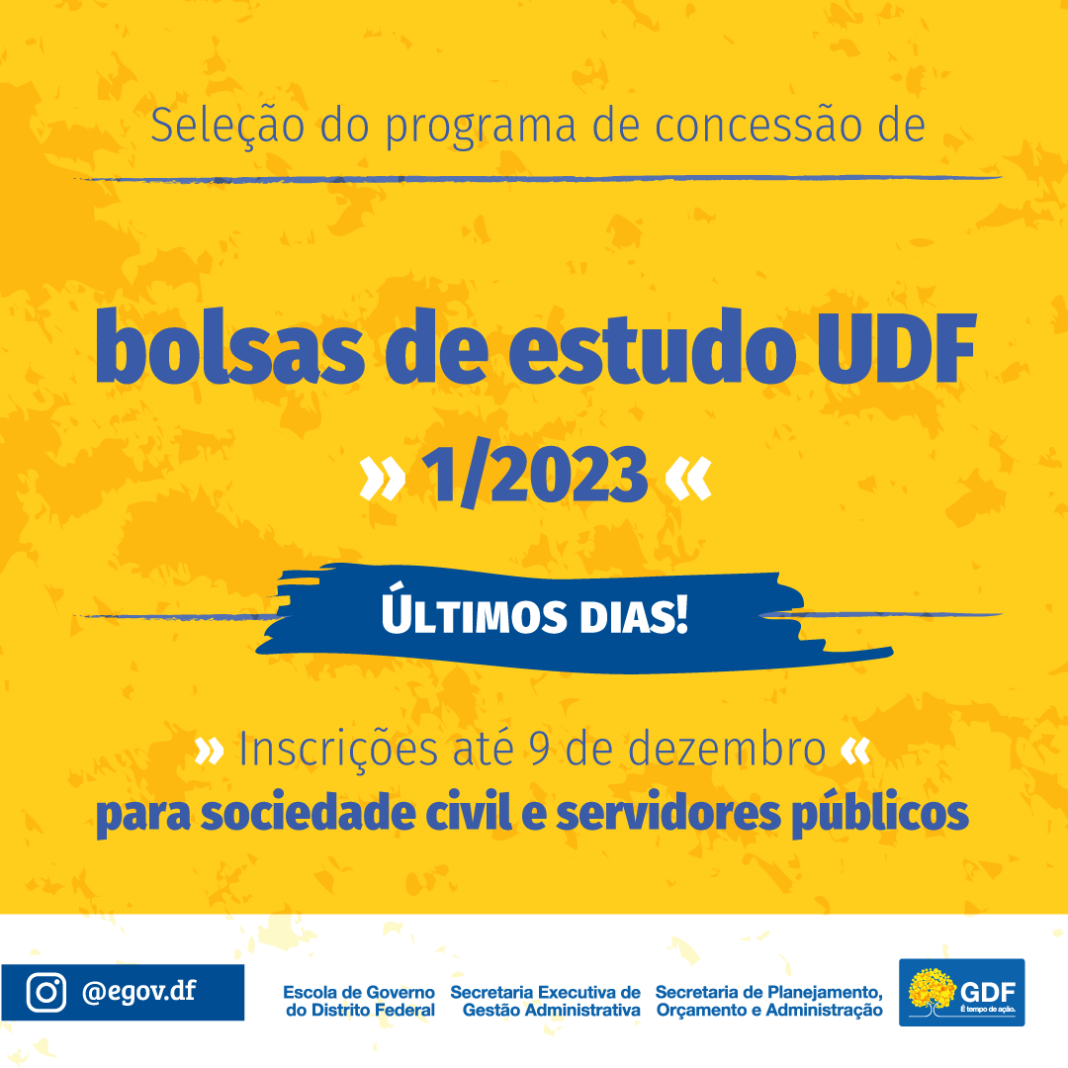 No dia 11 de novembro, a Escola de Governo do Distrito Federal (Egov) publicou no Diário Oficial do DF (DODF) o edital para o processo seletivo do Programa de Concessão de Bolsas de Estudo junto ao UDF, destinado aos servidores públicos distritais e da rede pública de ensino.