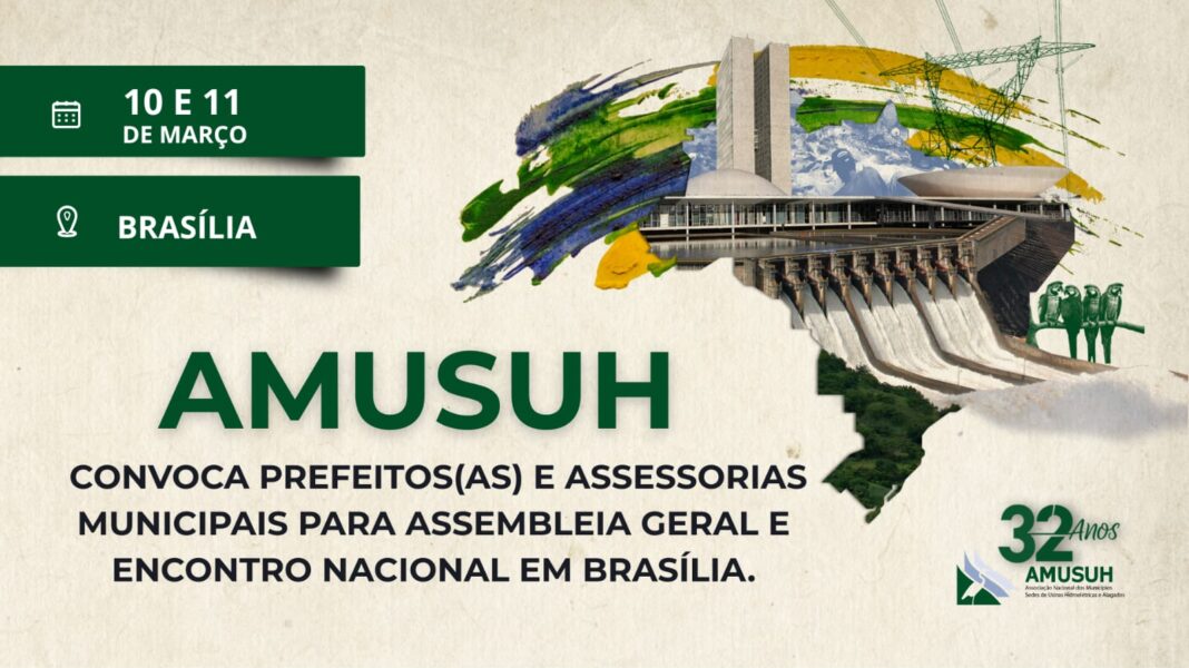 A Associação Nacional dos Municípios Sedes de Usinas Hidroelétricas e Alagados (AMUSUH) realiza, nos dias 10 e 11 de março, o seu Encontro Nacional. O evento, que reunirá prefeitos de todas as regiões do país, terá como ponto alto a Assembleia Geral, momento decisivo para alinhar as pautas estratégicas que impactam diretamente a arrecadação e o desenvolvimento de centenas de cidades brasileiras.