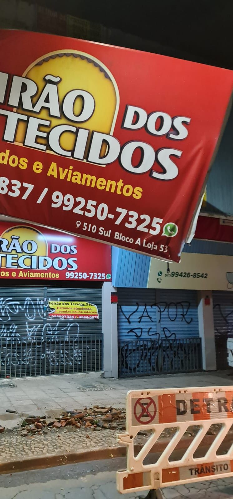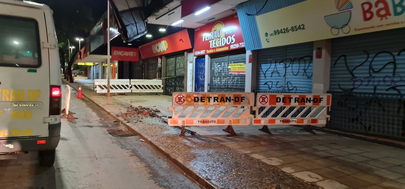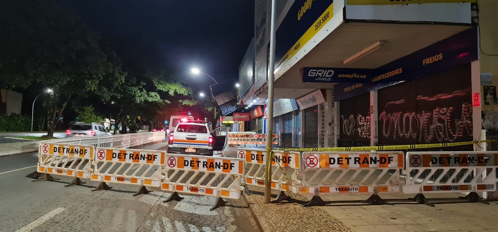 Na noite desta quarta-feira (2), agentes de trânsito do Detran-DF, em patrulhamento, observaram o risco de queda do banner da fachada de uma loja na 510 Sul e acionou a Defesa Civil, que recomendou o bloqueio de parte da via para evitar acidentes.