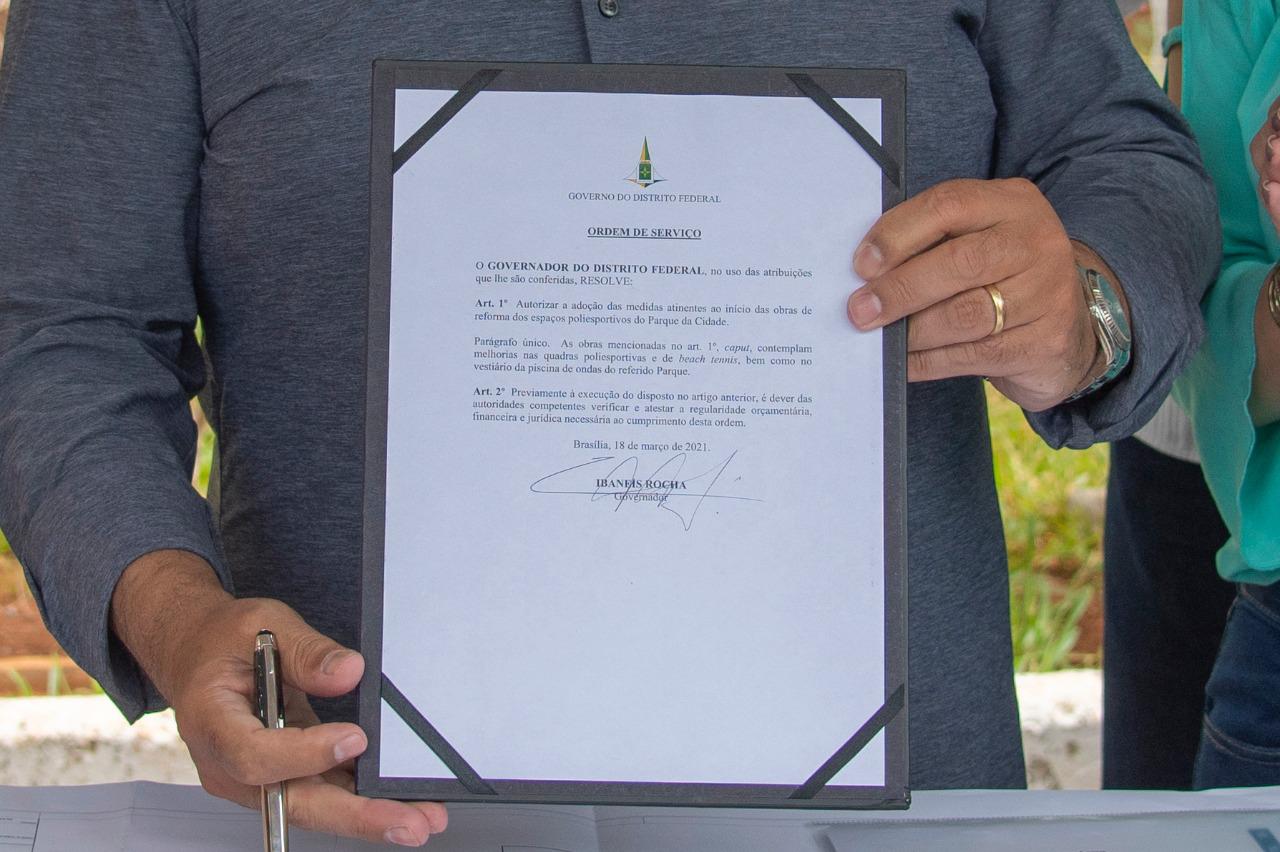 O governador Ibaneis Rocha assinou, na manhã desta quinta-feira (18), a ordem de serviço para que 27 quadras recebam pintura, substituição de alambrados, pisos, iluminação e adequação de acessibilidade. O investimento será de um R$ 1 milhão, recurso do governo federal que estava parado desde 2017. A Secretaria de Obras e Infraestrutura será responsável pela execução dos serviços. Além de trazer mais conforto e segurança para os frequentadores do parque, o investimento também contribui com a geração de 60 oportunidades de emprego. Os trabalhos devem ser finalizados no segundo semestre deste ano.