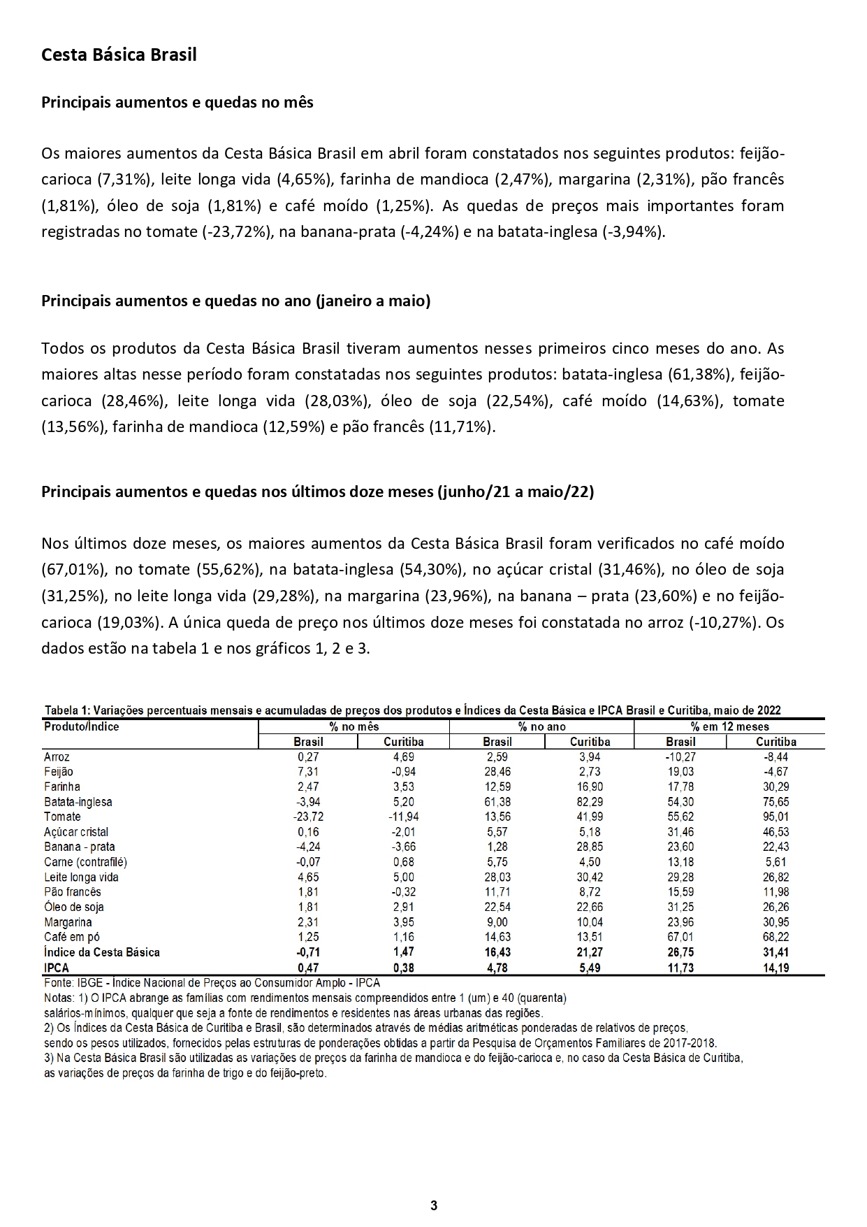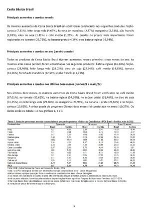 Em maio, a Cesta Básica Brasil registrou queda de 0,71%. Nos primeiros cinco meses do ano, a Cesta Básica subiu 16,43%. Comparativamente aos índices de inflação, nos últimos doze meses, o IPCA Nacional subiu 11,73%, contra 26,75% da Cesta Básica Brasil. “Sem dúvida a inflação afeta muito mais as pessoas de rendimentos mais baixos, mas na atual conjuntura ela tornou os preços dos itens da Cesta Básica inacessíveis para muitos brasileiros”, conclui o professor.