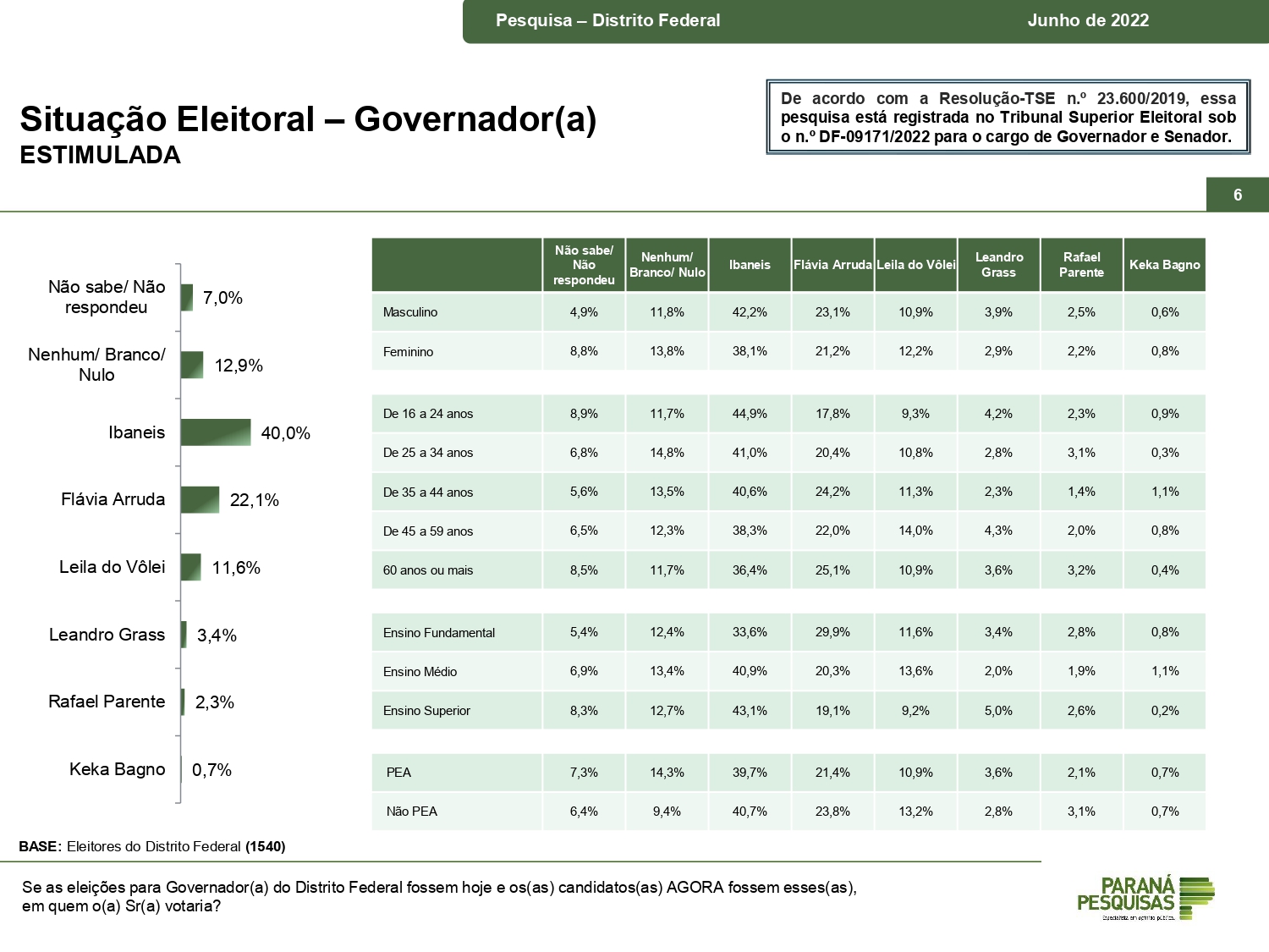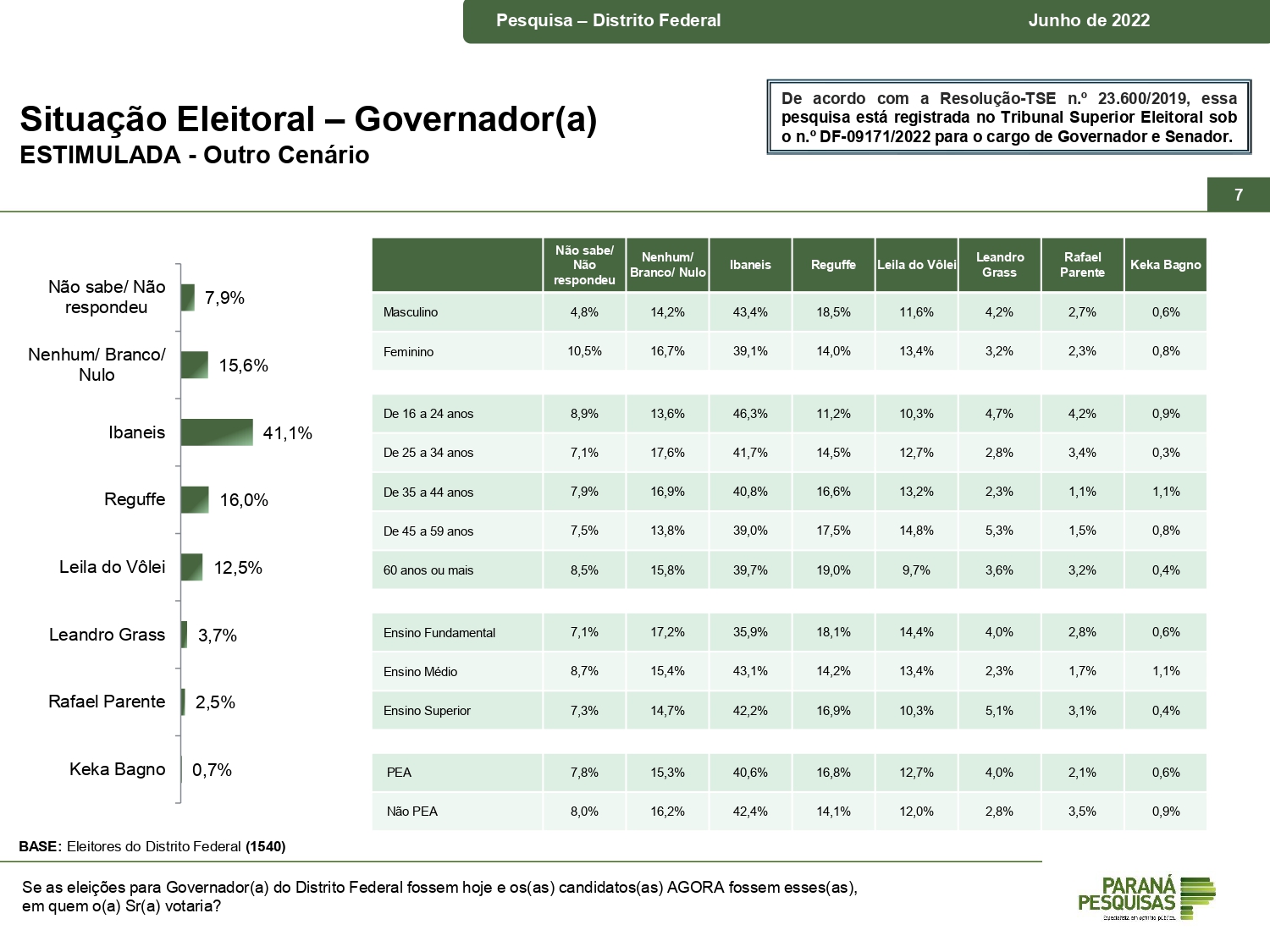 Uma nova pesquisa divulgada nesta segunda-feira(13), pelo Instituto Paraná Pesquisas aponta que Ibaneis segue na liderança com 17,3% das intenções de voto contra 2,1% de Arruda (PL) e 0,6% de Reguffe.