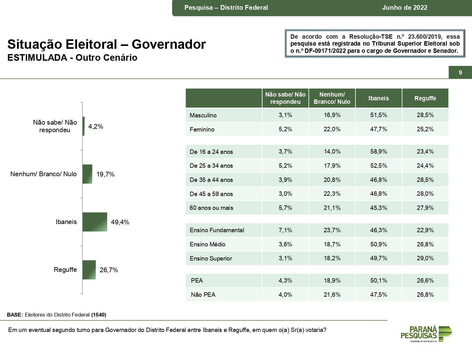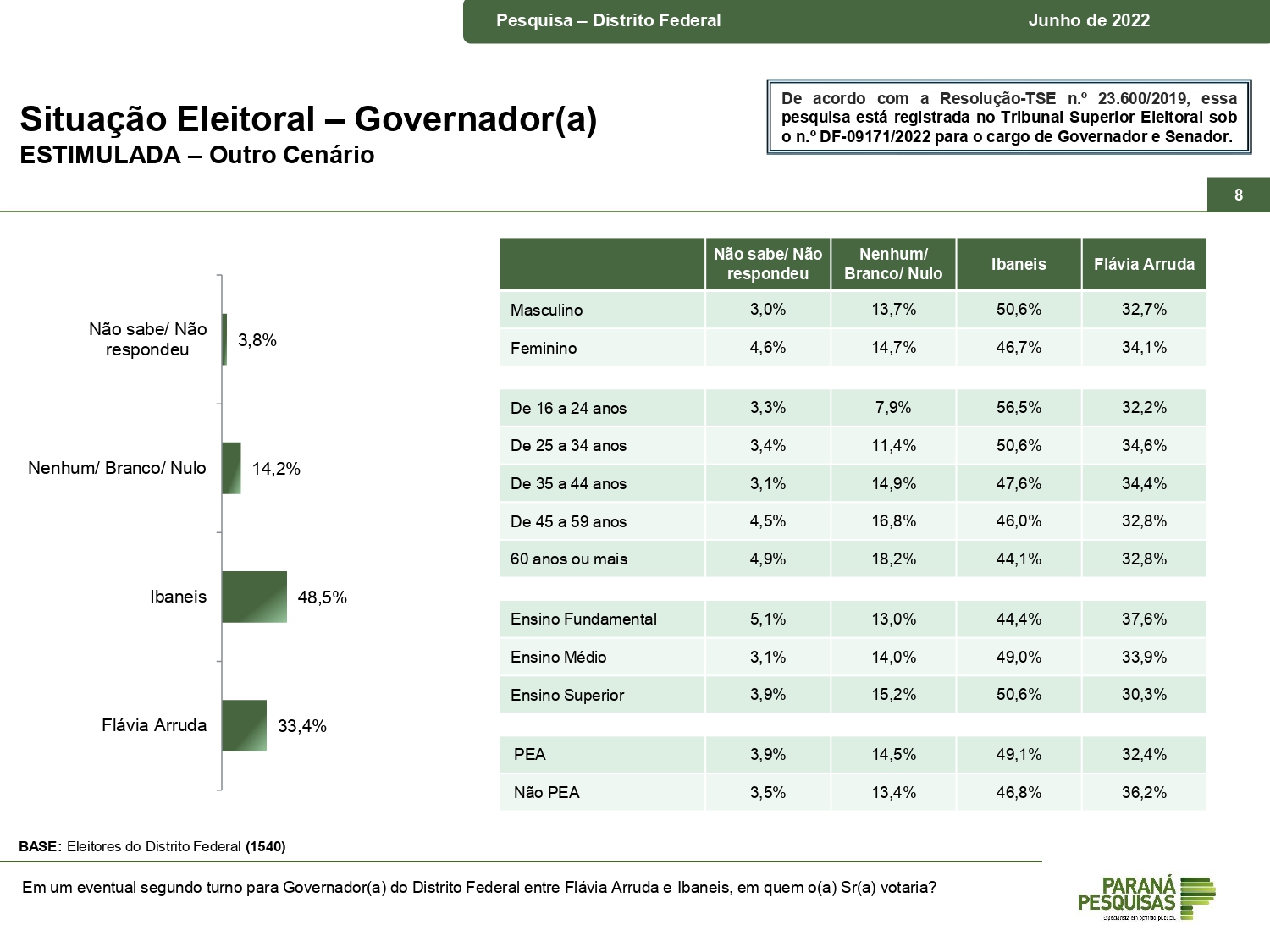 De acordo com o Instituto, a amostra atinge um nível de confiança de 95,0% para uma margem estimada de erro de aproximadamente 2,5% para os resultados gerais. Para a seleção da amostra utilizou-se o método de amostragem estratificada proporcional, conforme o mapeamento do Distrito Federal, em Unidades de Planejamentos Territoriais. A Paraná Pesquisas encontra-se registrada no Conselho Regional de Estatística da 1ª, 2ª, 3ª, 4ª, 5ª, 6ª e 7ª Região sob o nº 3122/22.