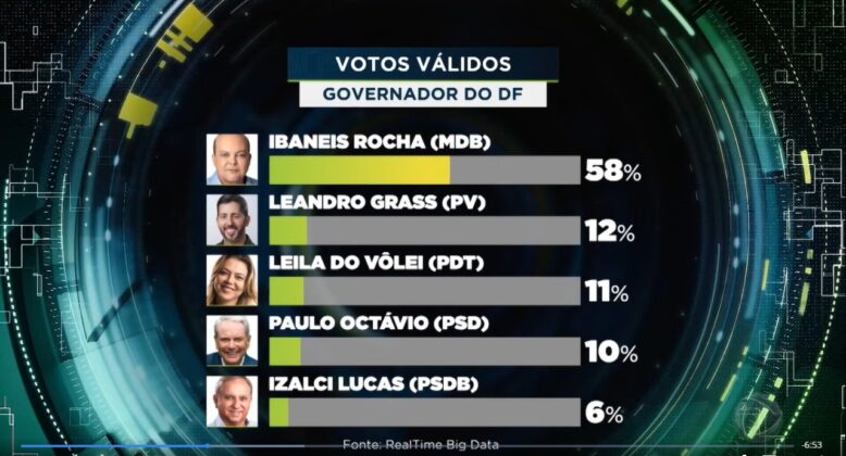 Já considerando somente os votos válidos, onde não não há os brancos, nulos ou indecisos, Ibaneis seria reeleito com 58% dos votos.