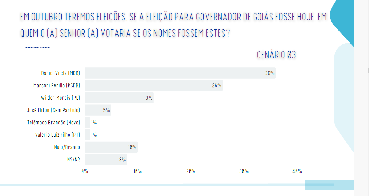 No principal cenário estimulado, Daniel Vilela aparece com 34% das preferências. Marconi Perillo ocupa a segunda posição com 24%, seguido por Adriana Accorsi (PT) e Wilder Morais (PL), ambos com 12%. Quando a lista de candidatos é reduzida em outros cenários, a força de Vilela sobe para 36%, enquanto Perillo oscila entre 26%, demonstrando a dificuldade do tucano em romper seu teto eleitoral.