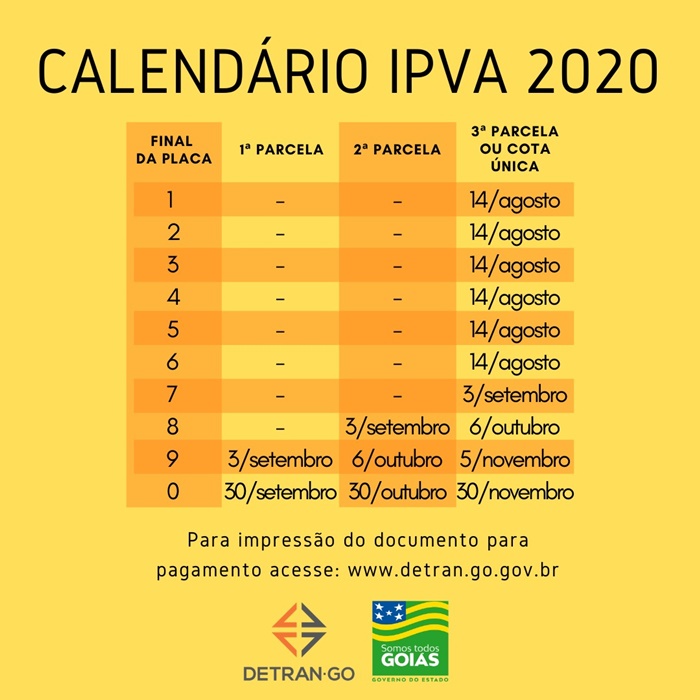 O Detran Goiás ressalta que o calendário não foi alterado para os casos da 1ª parcela de veículos com placa final 8 e 2ª parcela para placa final 7 – o vencimento de tais parcelas ocorreu no dia 6 de agosto.