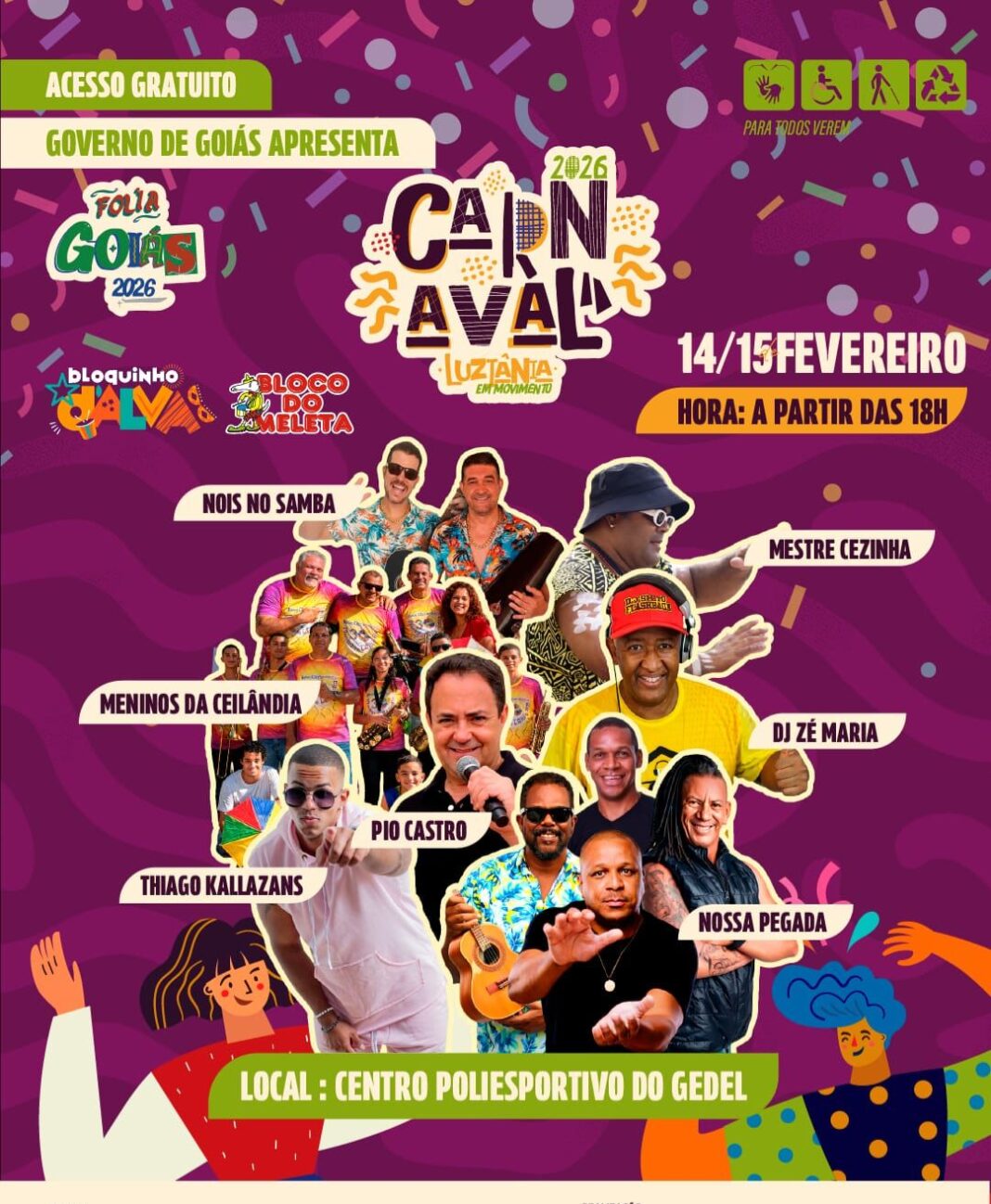 Com shows de Thiago Kallazans, Pio Castro e a tradicional Orquestra Popular Meninos da Ceilândia, sob o comando do Mestre Cezinha, Luziânia recebe neste sábado (14) e domingo (15) o projeto “Carnaval de Luziânia em Movimento 2026”. A festividade, contemplada pelo edital de manifestações carnavalescas do Estado de Goiás, ocupa o Complexo Esportivo GEDEL com uma programação gratuita que une música, inclusão e consciência ambiental a partir das 17h30.