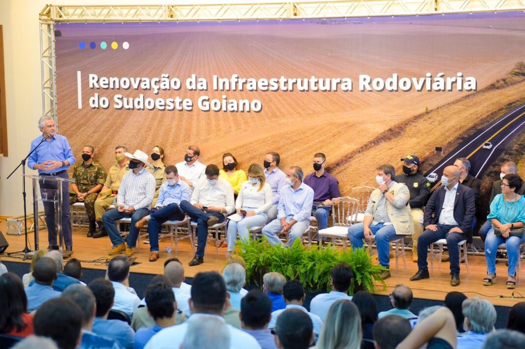 O governador Ronaldo Caiado participou, nesta quinta-feira (21), em Jataí, no Sudoeste do Estado, do anúncio das obras de renovação das rodovias federais da região, ao lado do ministro da Infraestrutura, Tarcísio Gomes de Freitas. O evento aconteceu no Sindicato Rural do município, onde foram apresentadas as ações realizadas nas vias sob responsabilidade do governo federal.