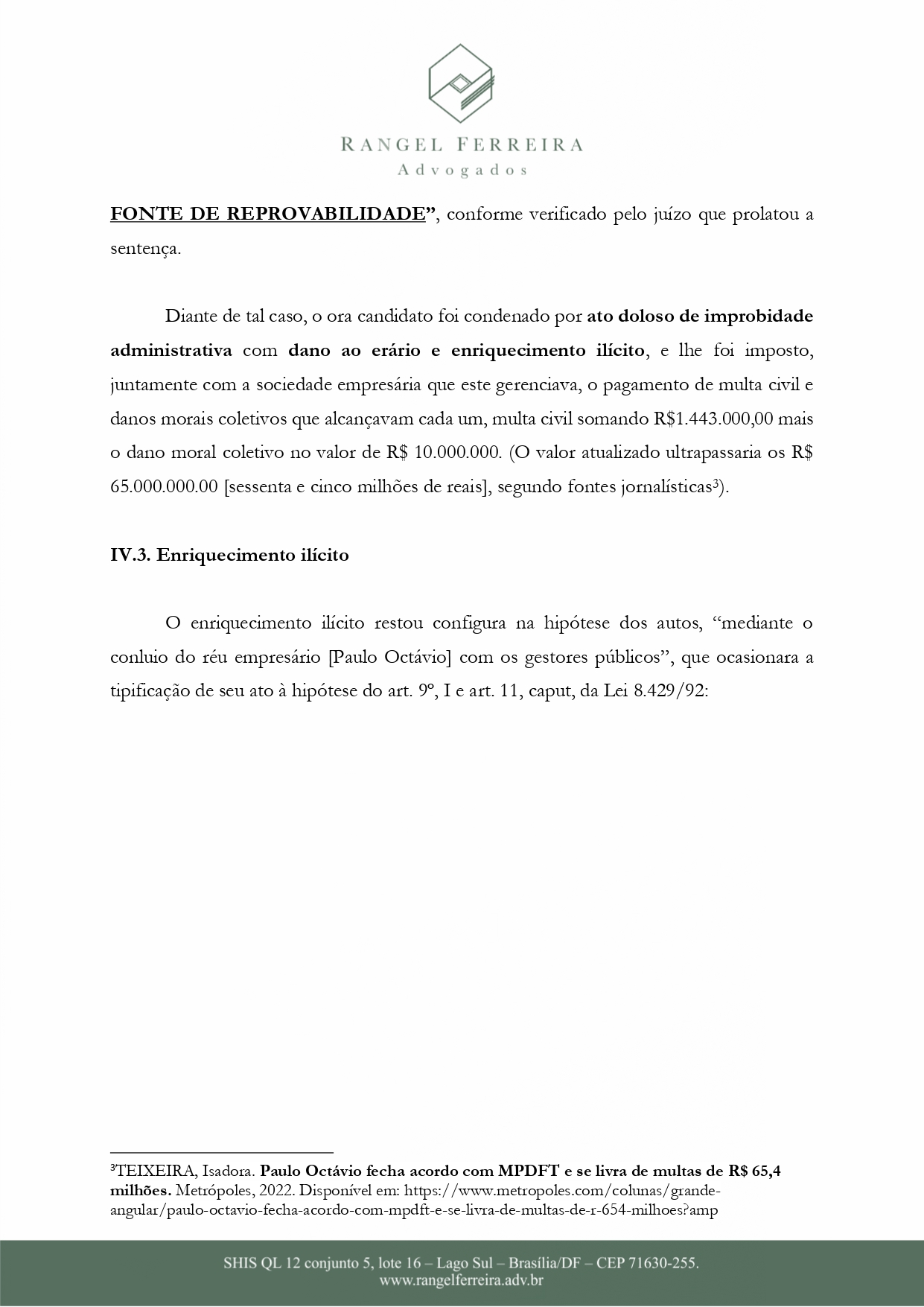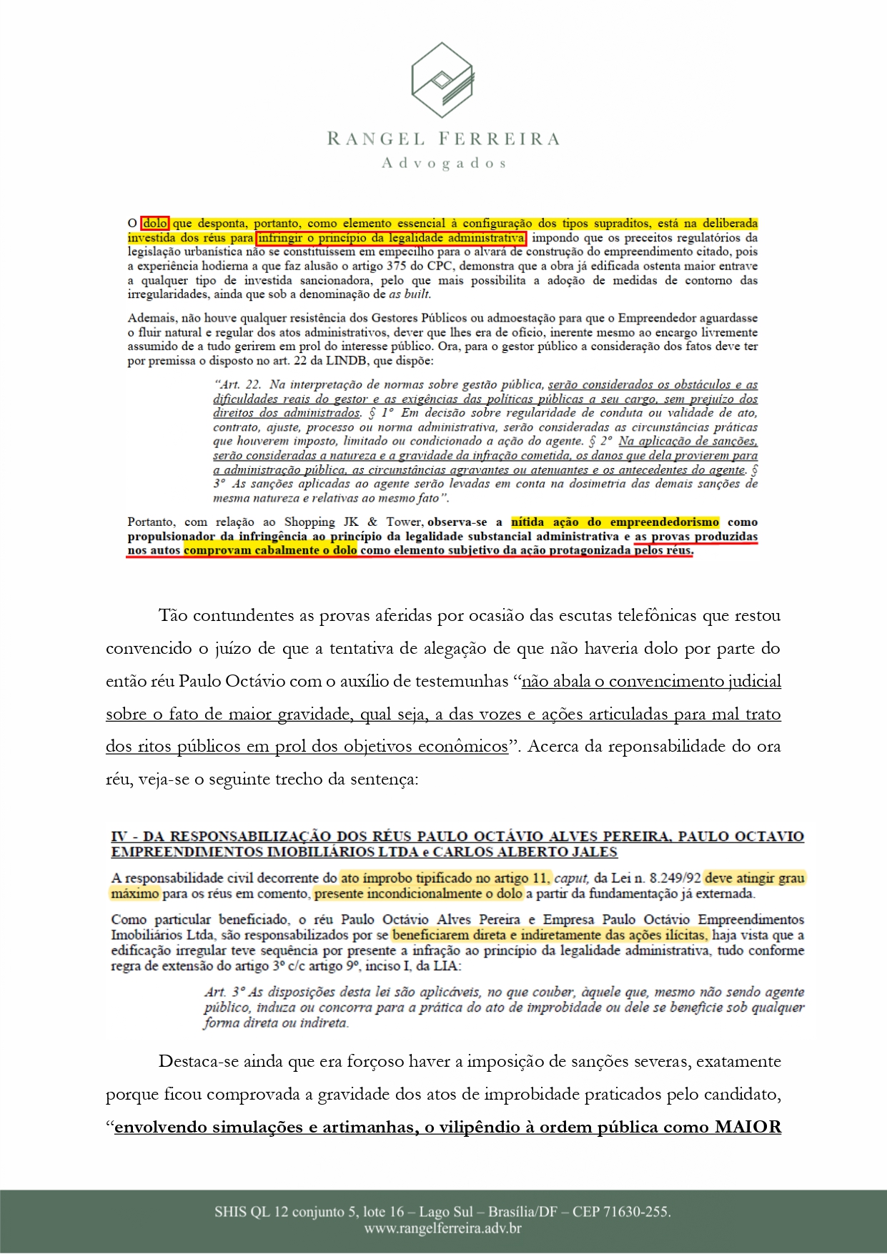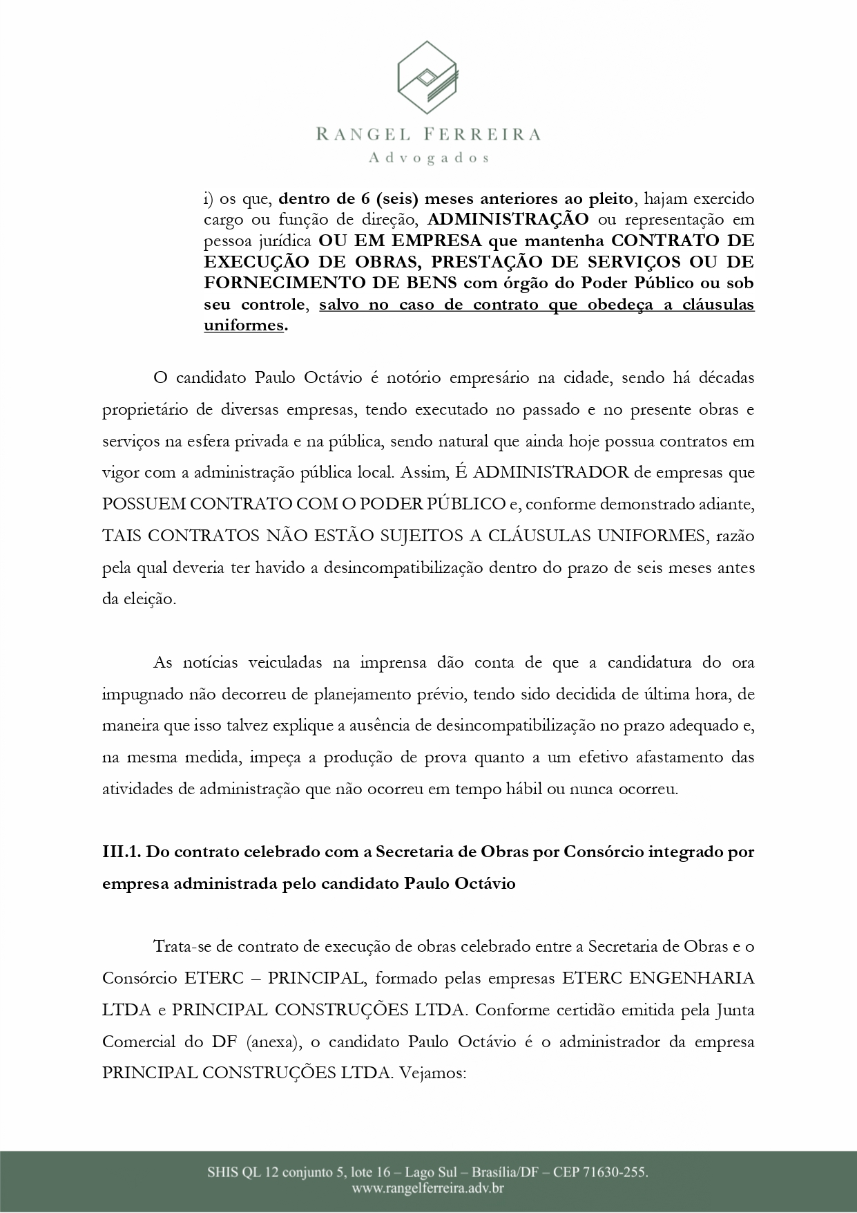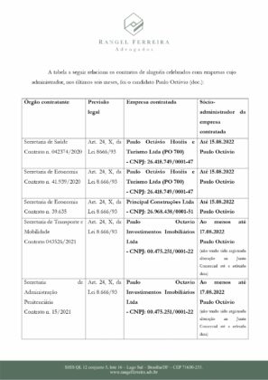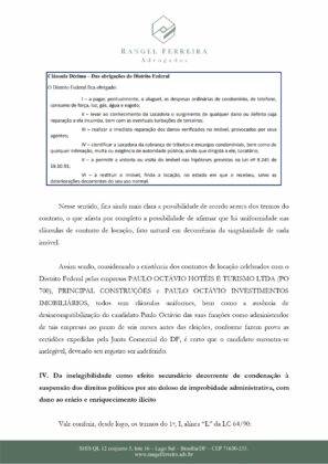 Entre as alegações, está o fato que Paulo Octávio não respeitou o período de desincompatibilização de empresas das quais ele é sócio- administrador e possui vínculo contratual com o GDF. Uma outra situação é que ele também foi condenado por ato doloso de improbidade administrativa, acrescido de “dano ao erário e enriquecimento ilícito”