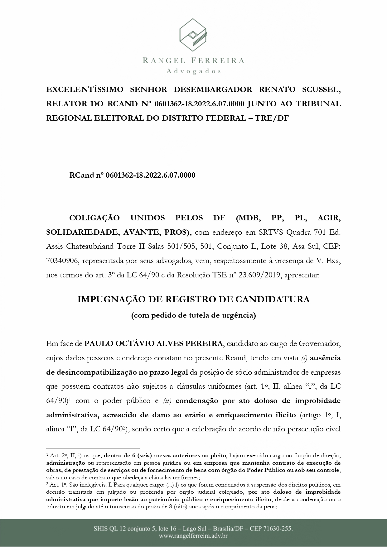 Desta vez, foi a Coligação Unidos pelo Distrito Federal — que tem como cabeça de chapa Ibaneis Rocha (MDB), o qual concorre à reeleição ao Buriti –, que apresentou, nesta terça-feira (23), o pedido de impugnação da candidatura de P.O.