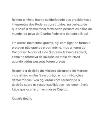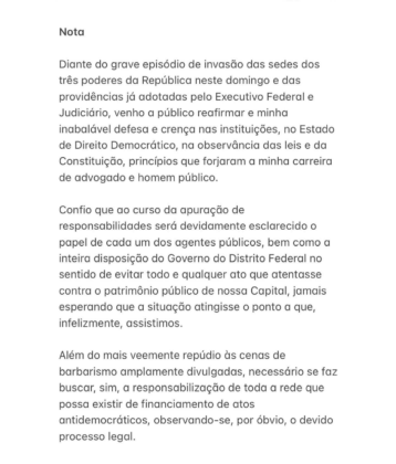 Em nota divulgada na tarde desta segunda-feira (9/1), Ibaneis declarou que reitera a “fé na Justiça e nas instituições democráticas”. “Vou aguardar com serenidade a decisão sobre as responsabilidades nos lamentáveis fatos que ocorreram em nossa capital”, afirmou.