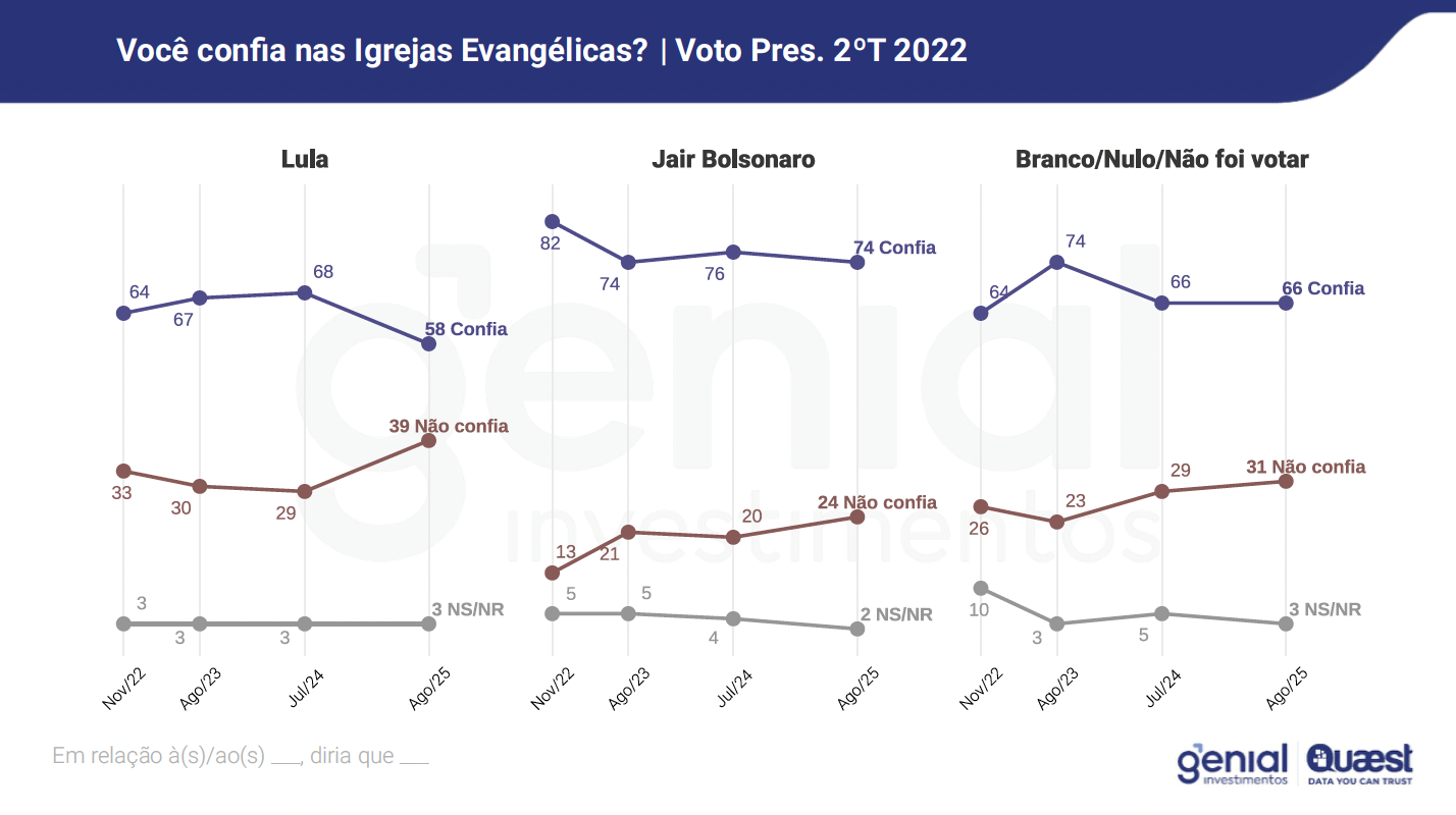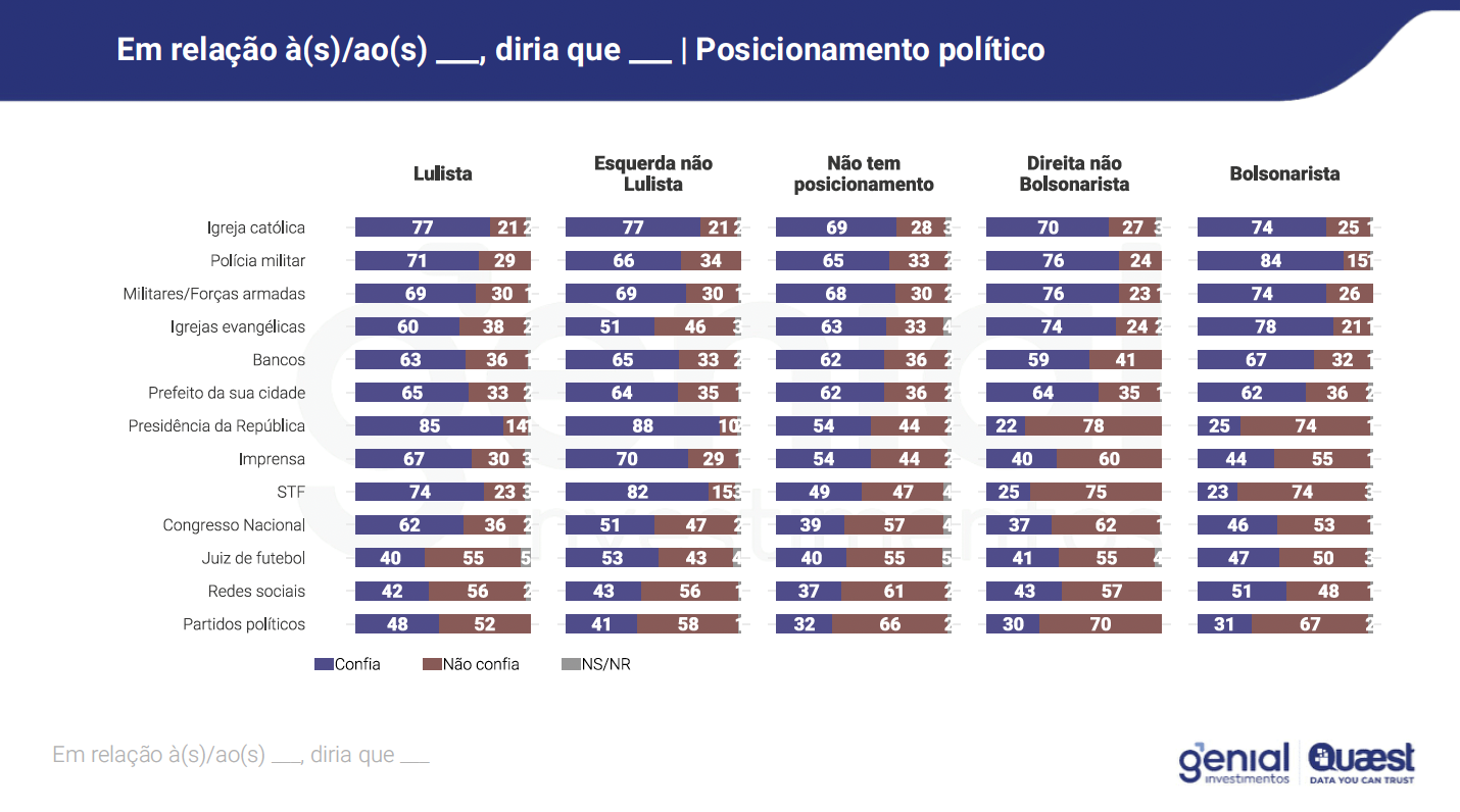 No campo oposto, entre os eleitores do presidente Lula, a desconfiança se direcionou para as igrejas evangélicas, cuja credibilidade despencou, sobretudo após 2024. Em contrapartida, a imprensa profissional consolidou-se como um pilar para este grupo: 67% dos lulistas afirmam confiar no trabalho jornalístico, enquanto a mesma instituição é vista com suspeita por quase 60% dos bolsonaristas.