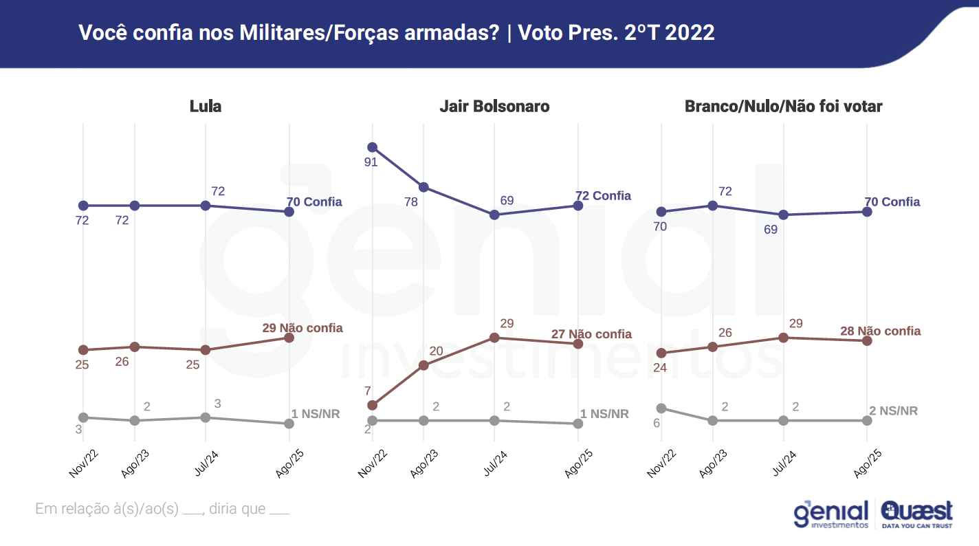 A pesquisa Genial/Quaest deixa claro que não existe uma “confiança nacional” homogênea. A análise dos dados por espectro político revela que a confiança se tornou um espelho da ideologia. Entre os eleitores do ex-presidente Jair Bolsonaro, por exemplo, a percepção sobre as Forças Armadas sofreu uma reviravolta, com a desconfiança crescendo acentuadamente entre 2022 e 2024, um possível reflexo da frustração com a ausência de uma intervenção militar. O mesmo grupo alterou drasticamente sua visão sobre o STF, que passou a ser o principal alvo de críticas a partir de 2024.