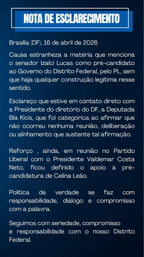 A movimentação de Izalci Lucas, que recentemente migrou para o PL, vem sendo observada com lupa pelos bastidores da política brasiliense. No entanto, Michelle foi enfática ao negar que o partido tenha dado o sinal verde para as pretensões majoritárias do senador: “Esclareço que estive em contato direto com a Presidente do diretório do DF, a Deputada Bia Kicis, que foi categórica ao afirmar que não ocorreu nenhuma reunião, deliberação ou alinhamento que sustente tal afirmação”, diz trecho da nota.