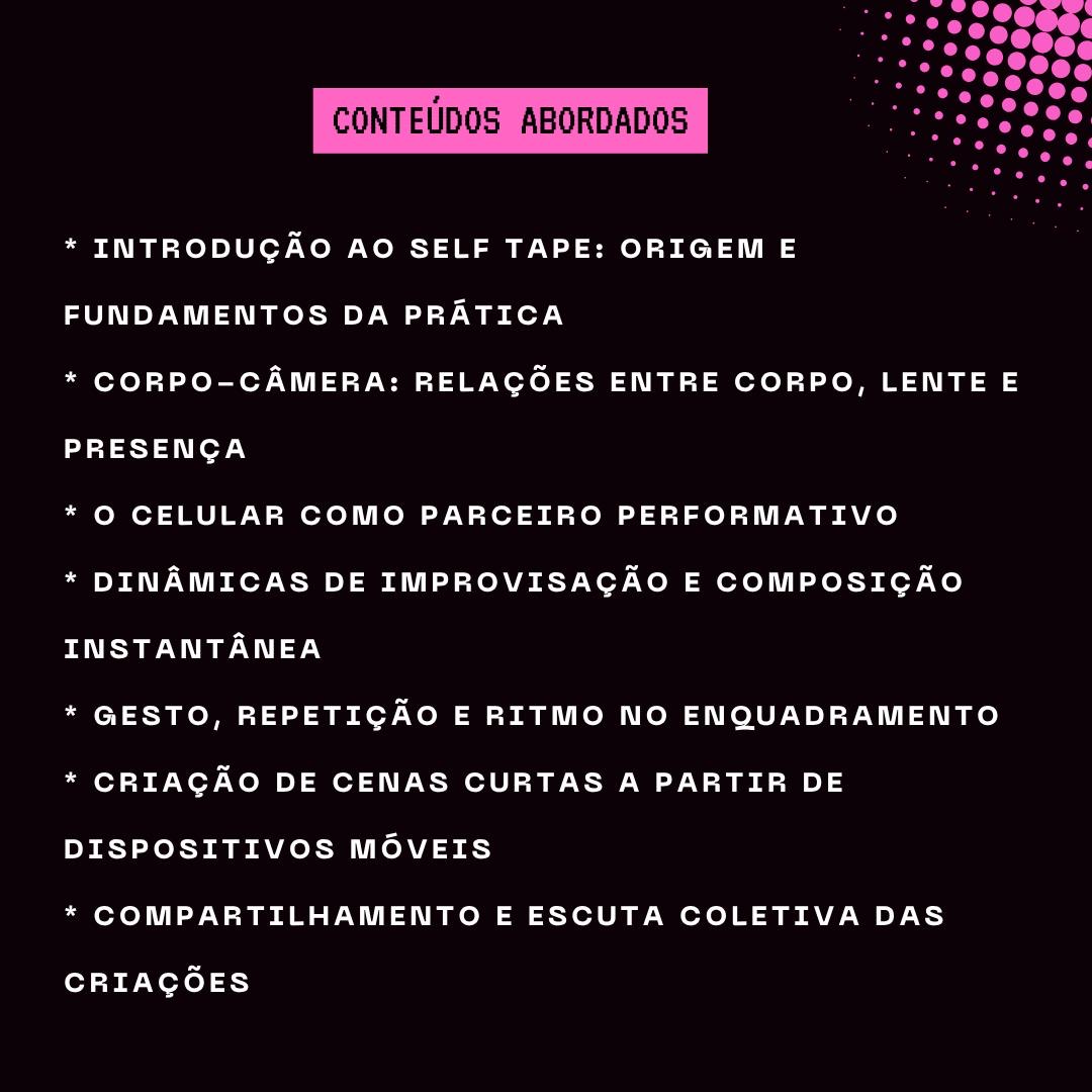 A metodologia alia práticas corporais à consciência do dispositivo tecnológico como um parceiro de cena, estimulando a criação de material autoral através de experimentos performativos individuais e coletivos, com foco na escuta, na autoimagem e no jogo cênico com a câmera.