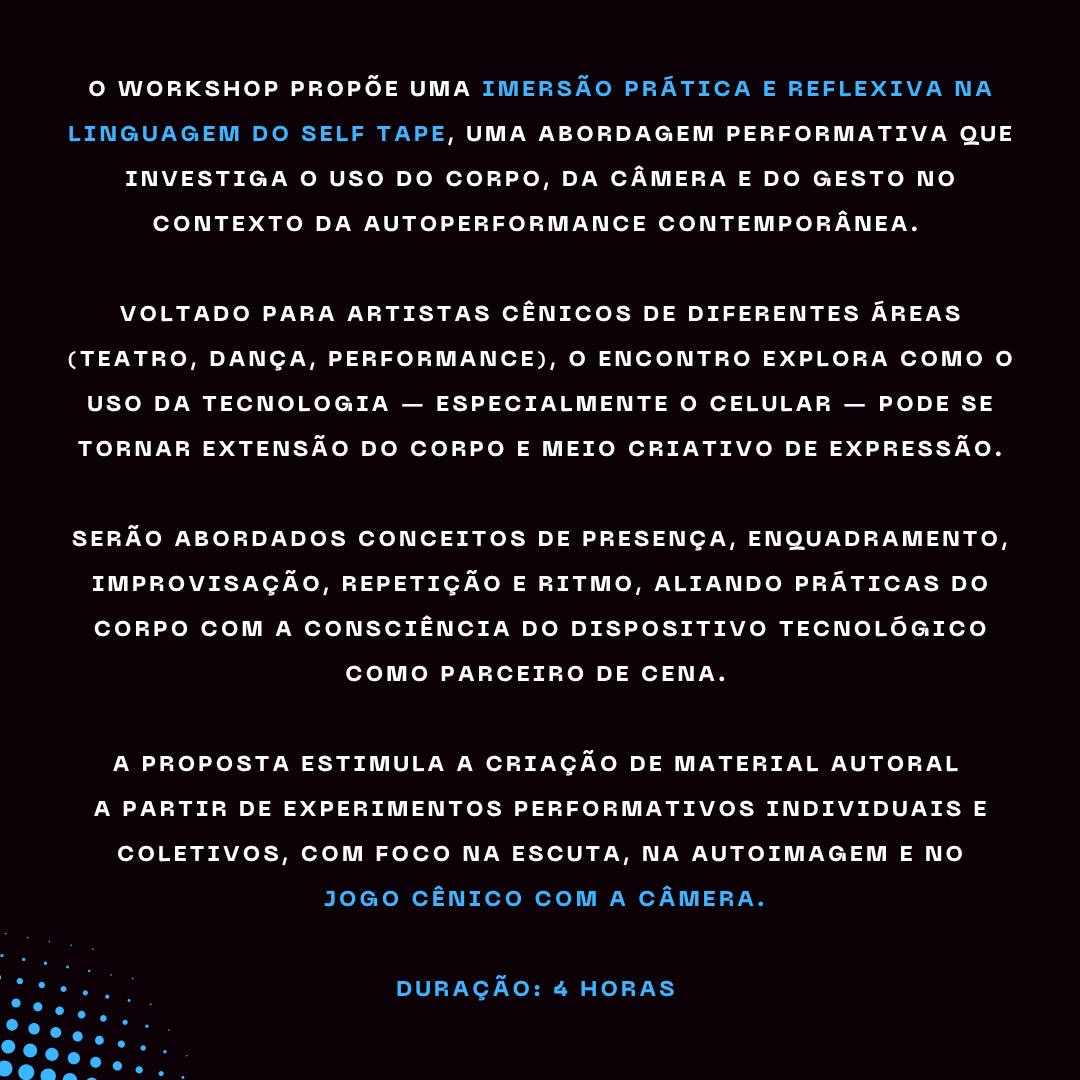 No próximo dia 19 de julho, Ubatuba sediará o workshop “Selfie Tape para Artistas Cênicos: Expandindo a Performance”, uma imersão prática e reflexiva que visa explorar a interseção entre o corpo, a câmera e o gesto na autoperformance contemporânea.