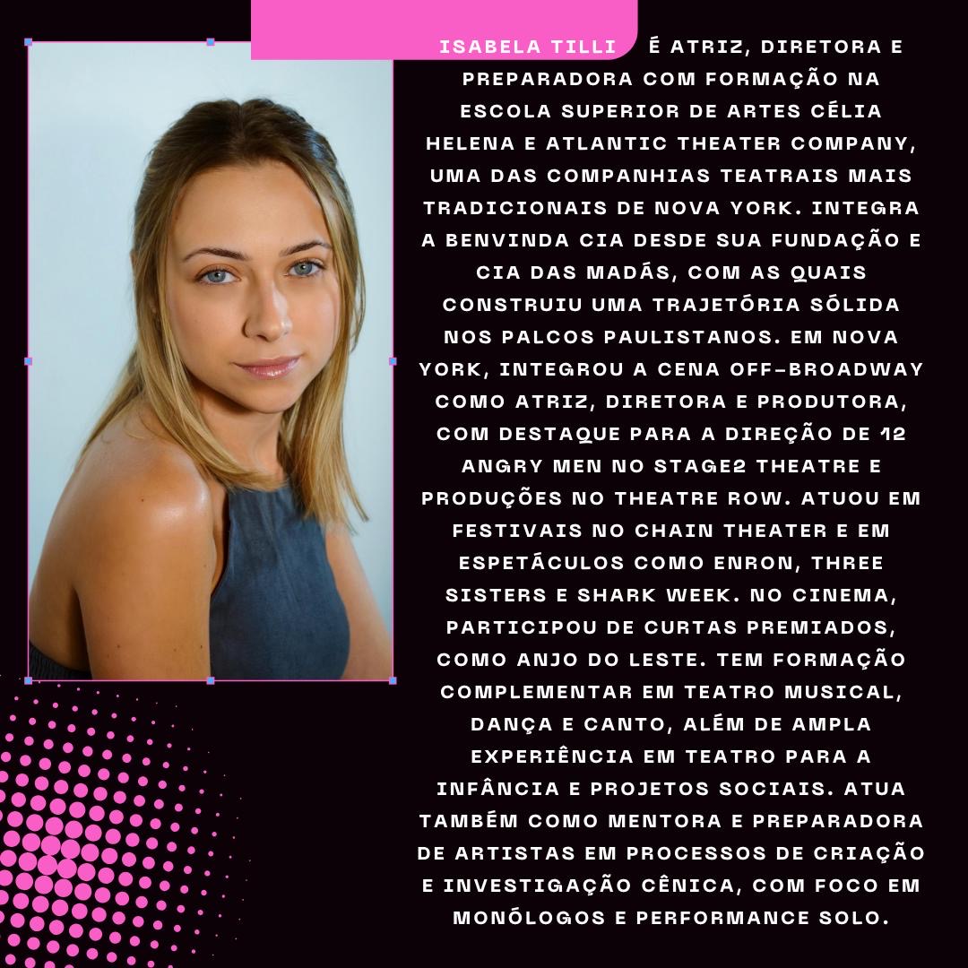 Isabela Tilli é atriz, diretora e preparadora com sólida formação na Escola Superior de Artes Célia Helena e na Atlantic Theater Company, uma das mais tradicionais companhias teatrais de Nova York.