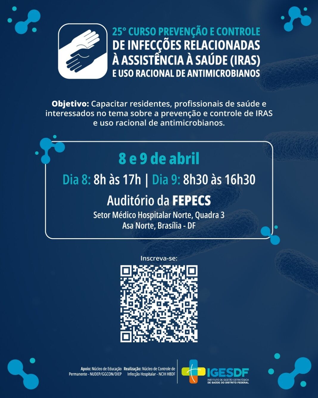 Em um cenário no qual a segurança do paciente se torna cada vez mais importante, a qualificação dos profissionais de saúde ganha papel decisivo. Com esse foco, o Instituto de Gestão Estratégica de Saúde do Distrito Federal (IgesDF) promove, na quarta (8) e na quinta-feira (9), o 25º Curso de Prevenção e Controle de Infecções Relacionadas à Assistência à Saúde e Uso Racional de Antimicrobianos.