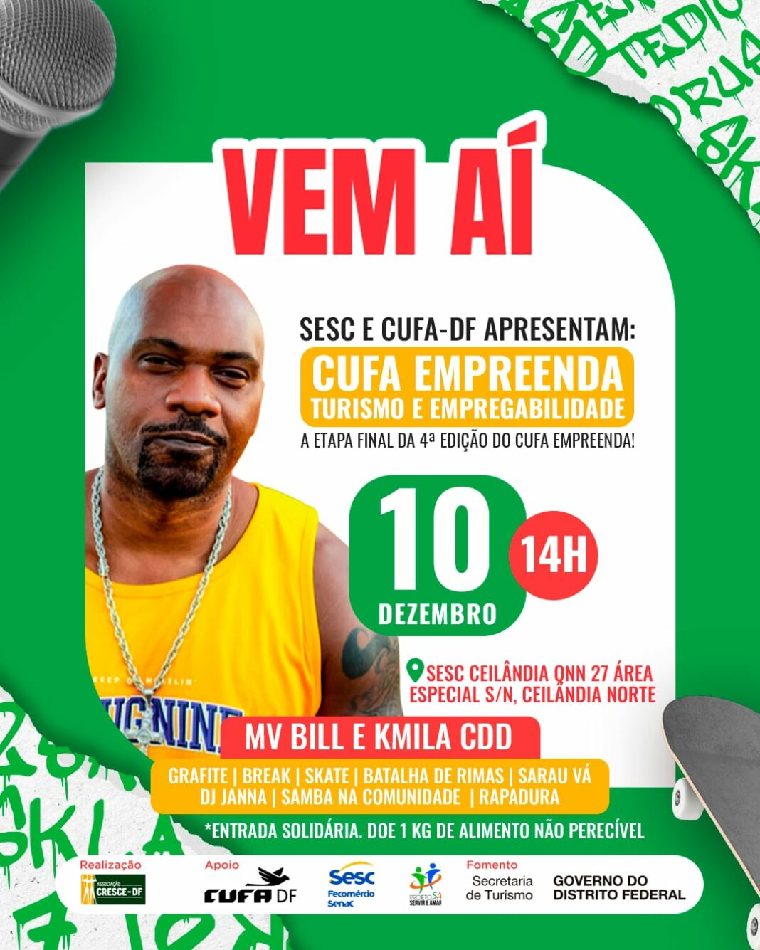 A Central Única das Favelas do Distrito Federal encerrará neste sábado (10) a 4ª edição do Cufa Empreenda – Turismo e Empregabilidade. Com vasta programação cultural e shows dos rappers mvbill e Rapadura, o fechamento da edição deste ano contará com grande festa marcada para acontecer a partir das 14h, no Sesc em Ceilândia. Além das atrações musicais, o evento terá pista de skate, grafite, batalha de rima e apresentação de break. A entrada é gratuita. A organização pede a colaboração de 1kg de alimento como entrada solidária.
