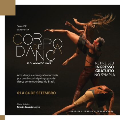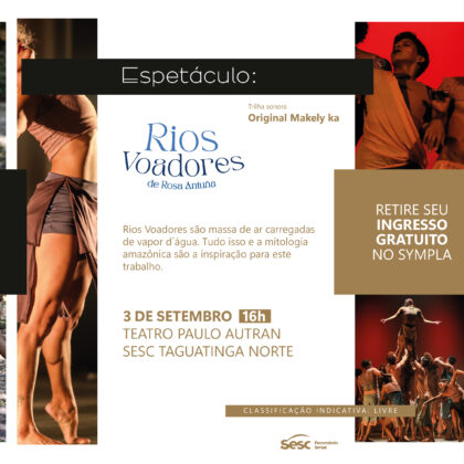 O espetáculo Corpo de Dança do Amazonas segue com programação aberta para este sábado (3), às 16h, na unidade do SESC de Taguatinga Norte (CNB 12 – Área Especial 2/3 – Taguatinga Norte ) , no Teatro Paulo Autran, com a temática: Rios Voadores e Rosa Antuna. Aos interessados, a classificação é livre, mediante entrega de 1kg de alimento não perecível, para o Mesa Brasil. Confira a programação completa AQUI – https://bit.ly/3AJ9Huc