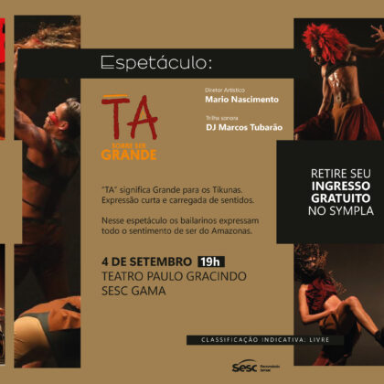 O grupo se apresenta também neste domingo (4), às 19h, no SESC Gama, com o tema: TA/ SOBRE SER GRANDE, que fala sobre o povo originário do Amazonas. O espetáculo traz sentidos e sons do ambiente, sob o pano de fundo da Amazônia, um território que abriga, acolhe, alimenta e precisa também de cuidados. Clique AQUI e retire o seu ingresso gratuito – https://bit.ly/3RaKOP2