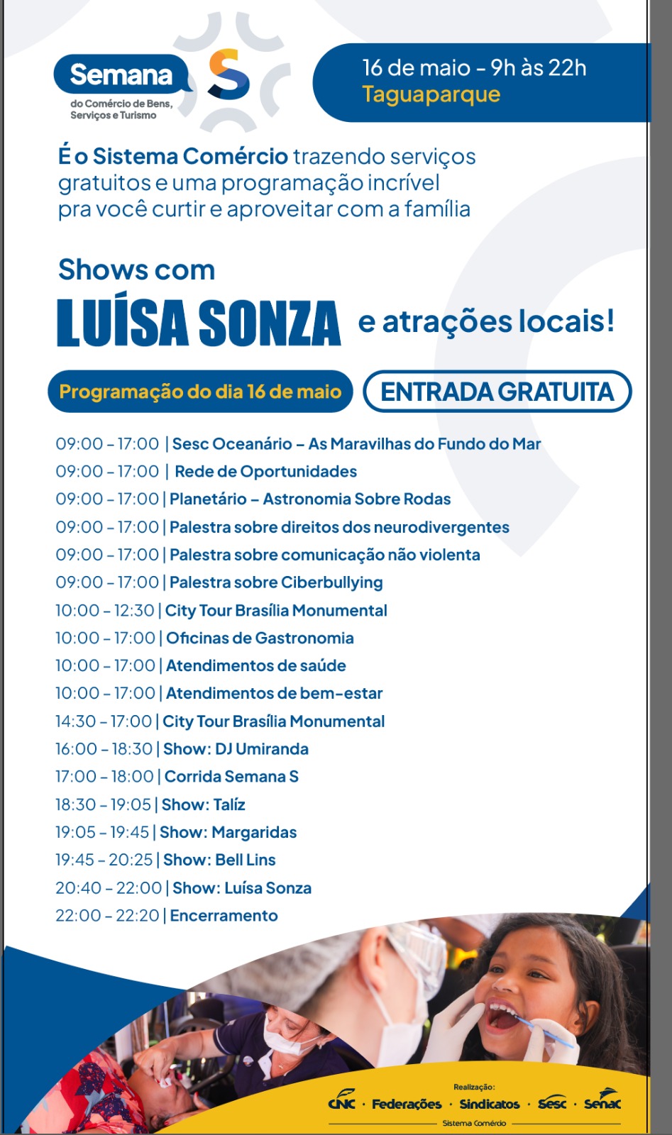 A distribuição do ingresso físico para o show da cantora Luísa Sonza, atração principal da Semana S de 2026, já começou. O evento será no dia 16 de maio, e a entrada é gratuita, mediante 1 kg de alimento não perecível. Será liberado um ingresso por CPF.