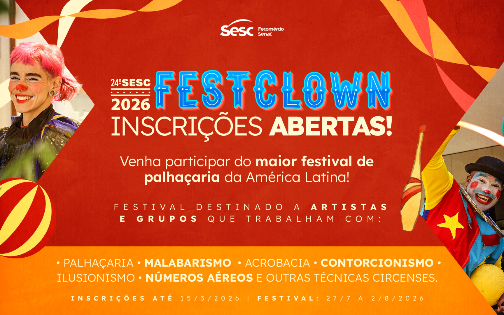 O Sesc-DF abriu as inscrições, em âmbito nacional, para a edição 2026 do Sesc Festclown – Festival Internacional de Palhaçaria e Circo. Artistas e grupos de todo o Brasil que atuam na linguagem circense podem se inscrever até o dia 15 de março de 2026, conforme edital disponível abaixo.