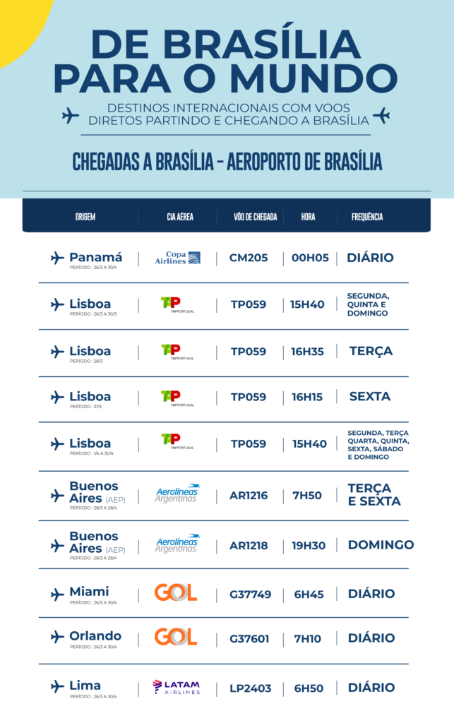 Lima, no Peru, é a mais nova rota internacional com voo direto partindo de Brasília. Da capital também é possível embarcar diretamente para Lisboa (Portugal), Cidade do Panamá (Panamá), Miami e Orlando (Estados Unidos) e Buenos Aires (Argentina). Esse aumento de voos internacionais contou com a participação direta do Governo do Distrito Federal (GDF).